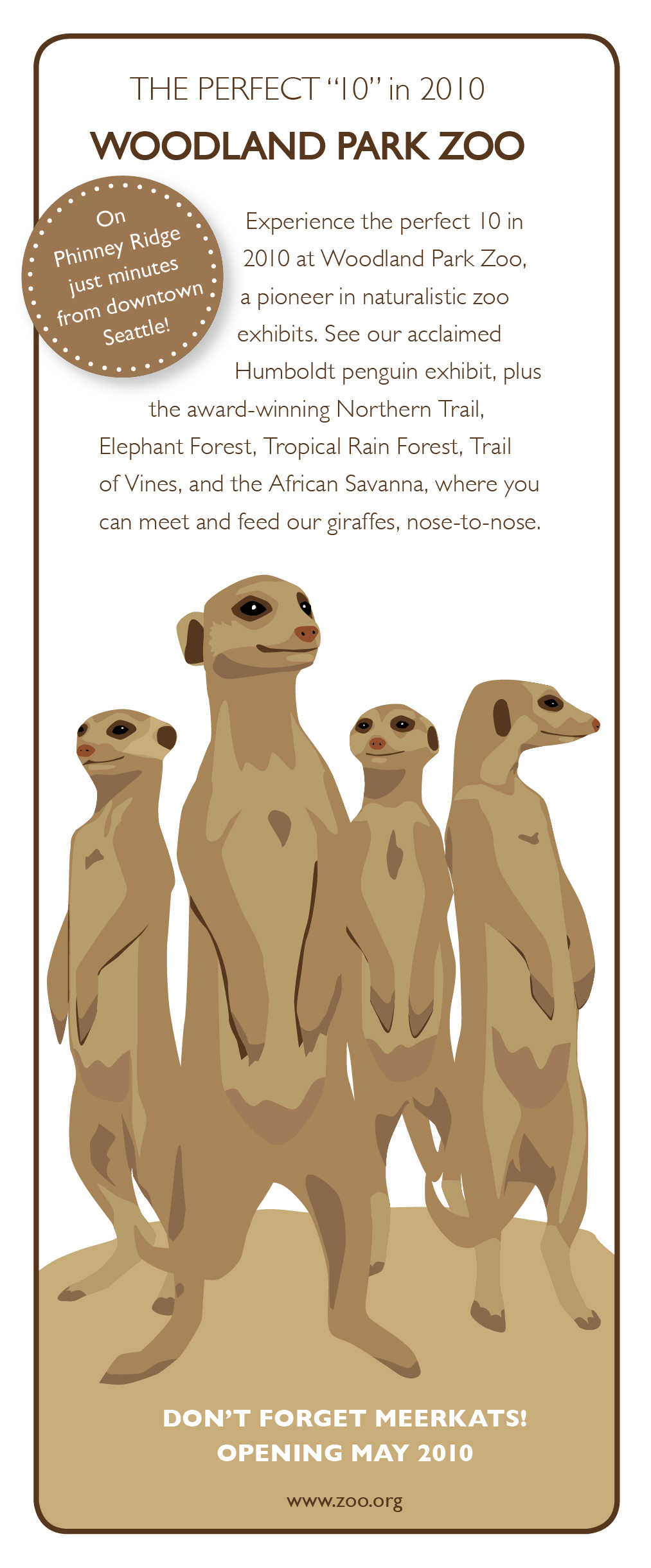 February 23, 2010May 9, 2021Meerkat Advertisements Title: Meerkat Advertisements 2010Client: Woodland Park ZooApplication: Web, print – “Where Quick Guide”Role: Illustrator, Designer Related