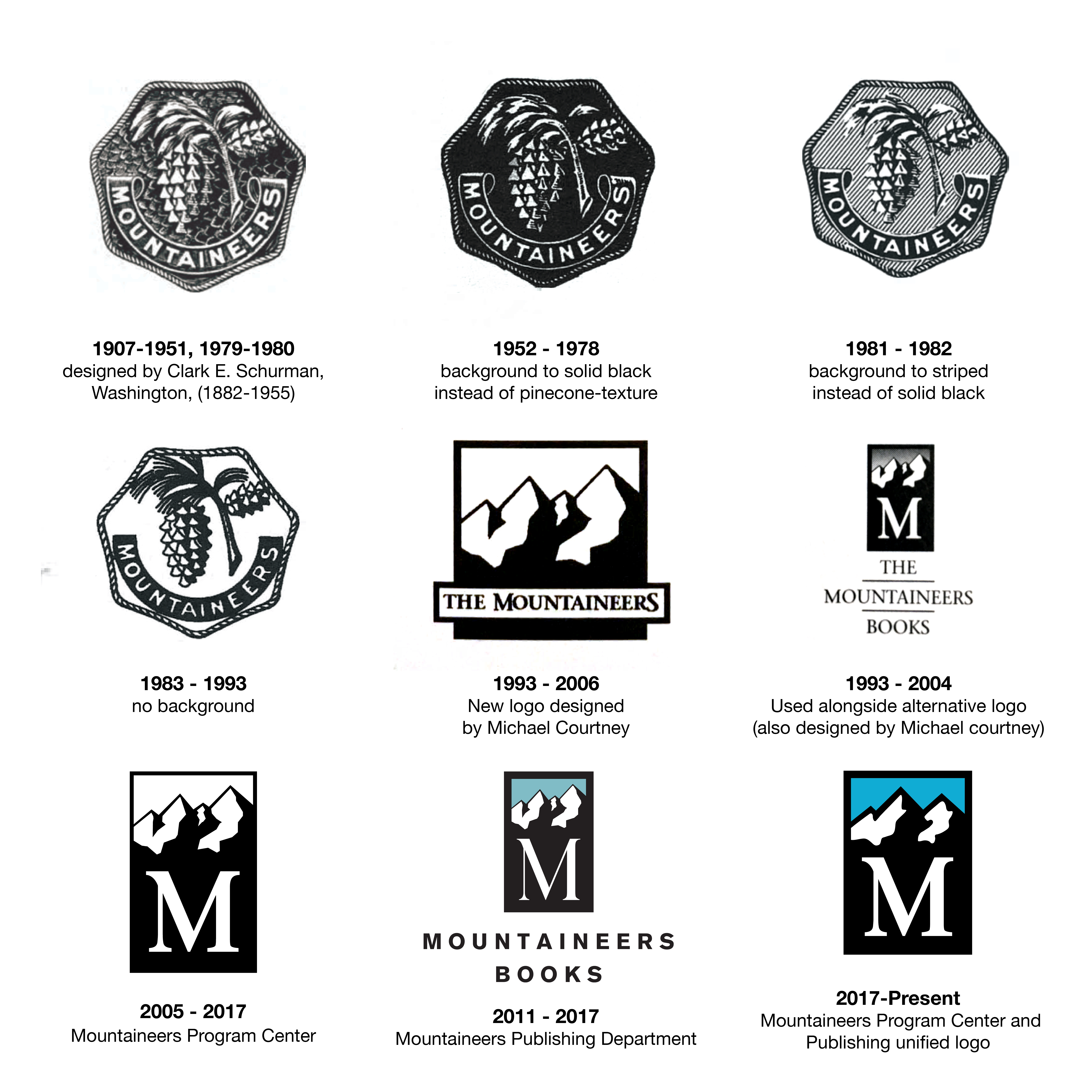 I was in charge of the visual branding for The Mountaineers from 2013-2018 and during that time, I updated and set branding standards, including updating their logo. This was an involved process that required approval from The Mountaineers leadership team and their two departments: Books and Programs. I worked with the books layout team as well as the development and marketing team. Below is a history of The Mountaineers logo: