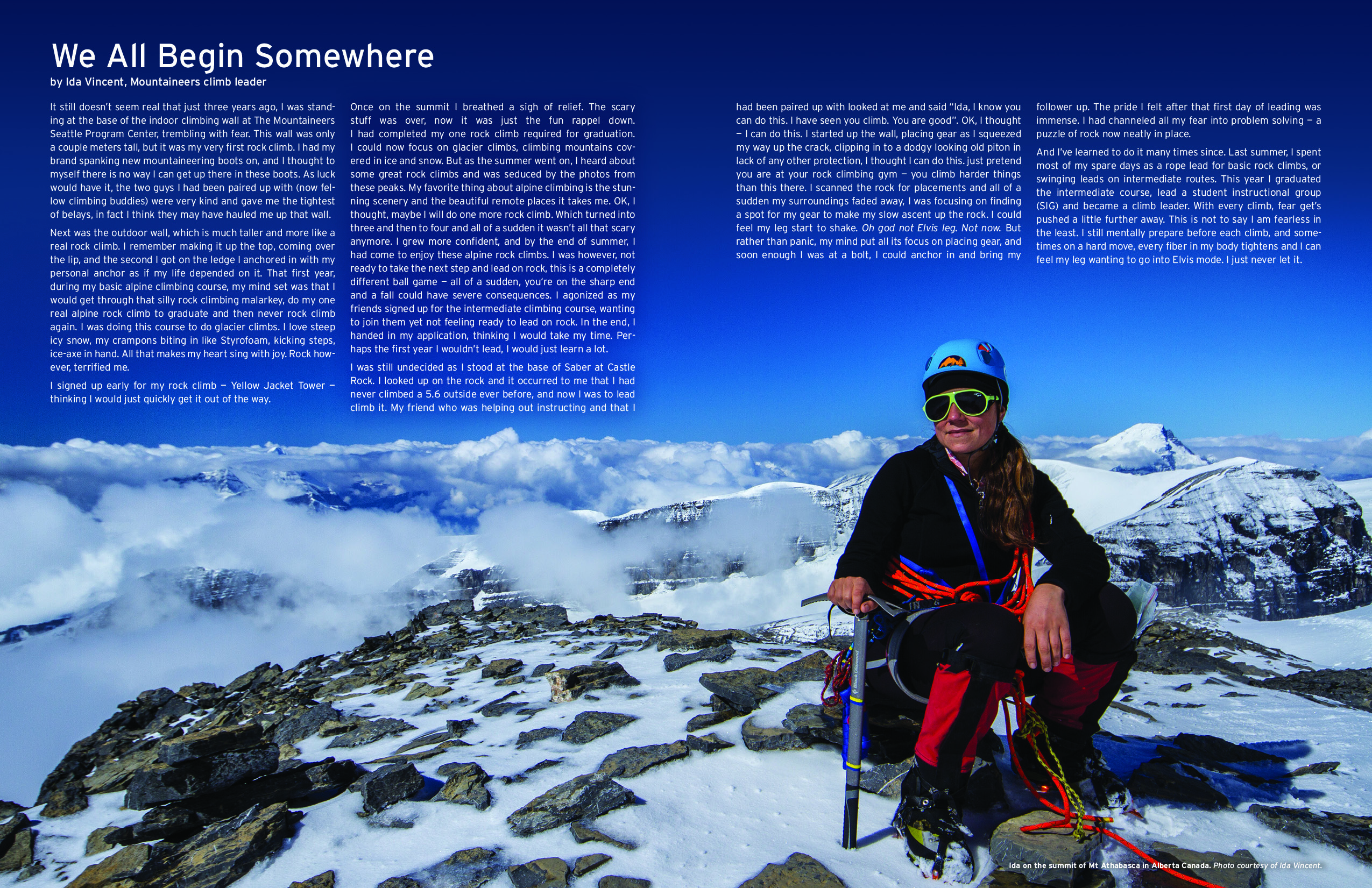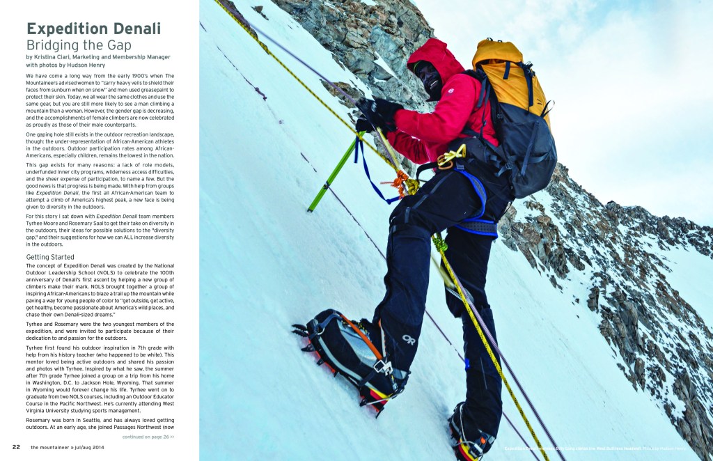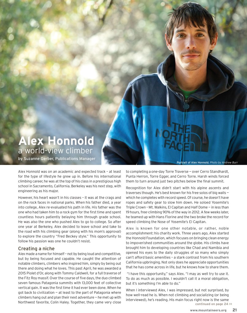 As the managing editor for Mountaineer magazine, I had the opportunity to lead a creative team of volunteer contributors, including writers, editors, proofers, and graphic designers. Together, we put together a quality publication that really got to the heart of what it meant to be a Mountaineer. This publication included interviews, regular conservation, development, and membership columns, along with directories for the organization’s many activities and courses. Each issue involved interviewing members of the outdoor community like the famous rock climber, Alex Honnold, or Mountaineers donors and board members. One of my favorite parts of the job was mentoring and coaching other writers as I edited their work, to help them tell their stories in a strong voice the way they wanted to be heard.