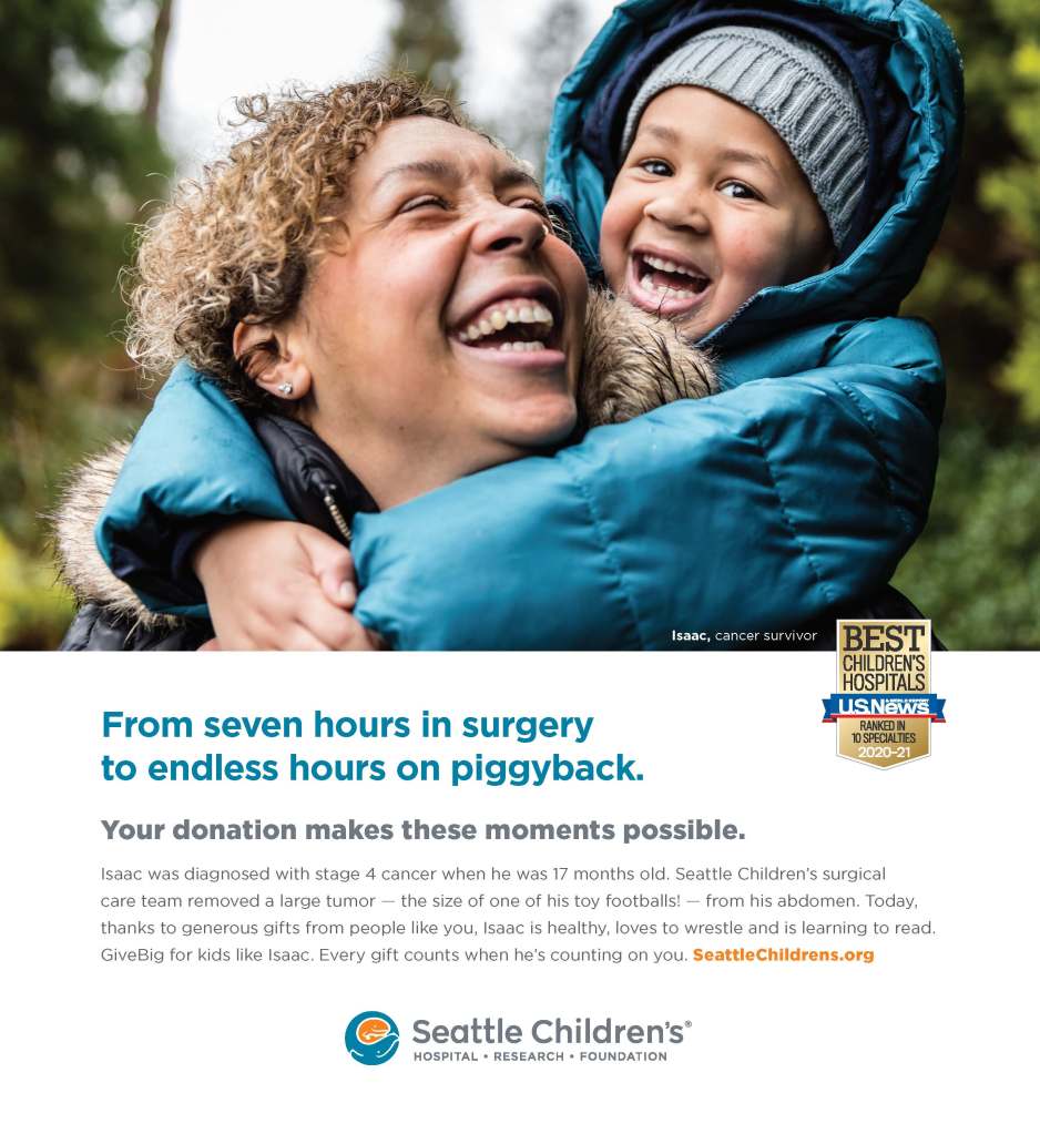 May 2, 2021October 24, 2021Seattle Children’s Give Big Ad Title: Give Big 2021 AdClient: Seattle Children’sApplication: Full page ad – Seattle TimesRole: Visual DesignerMaterials: Print and Digital Related