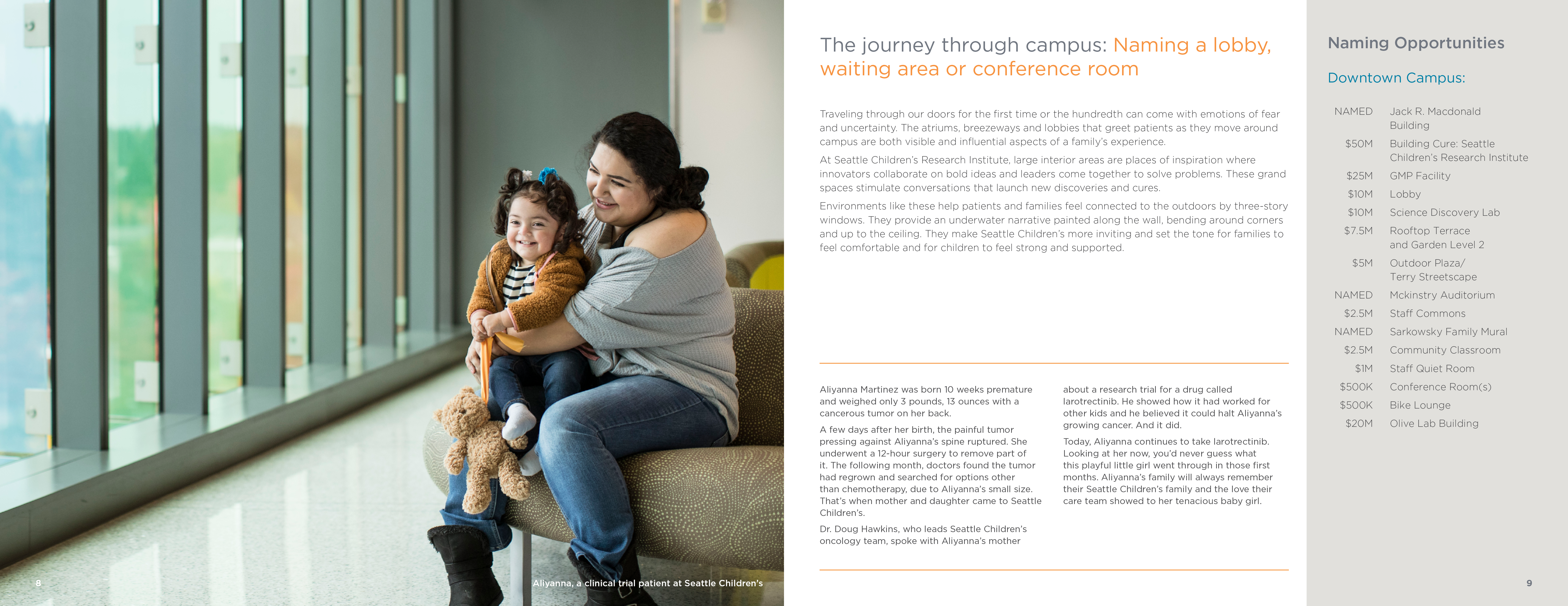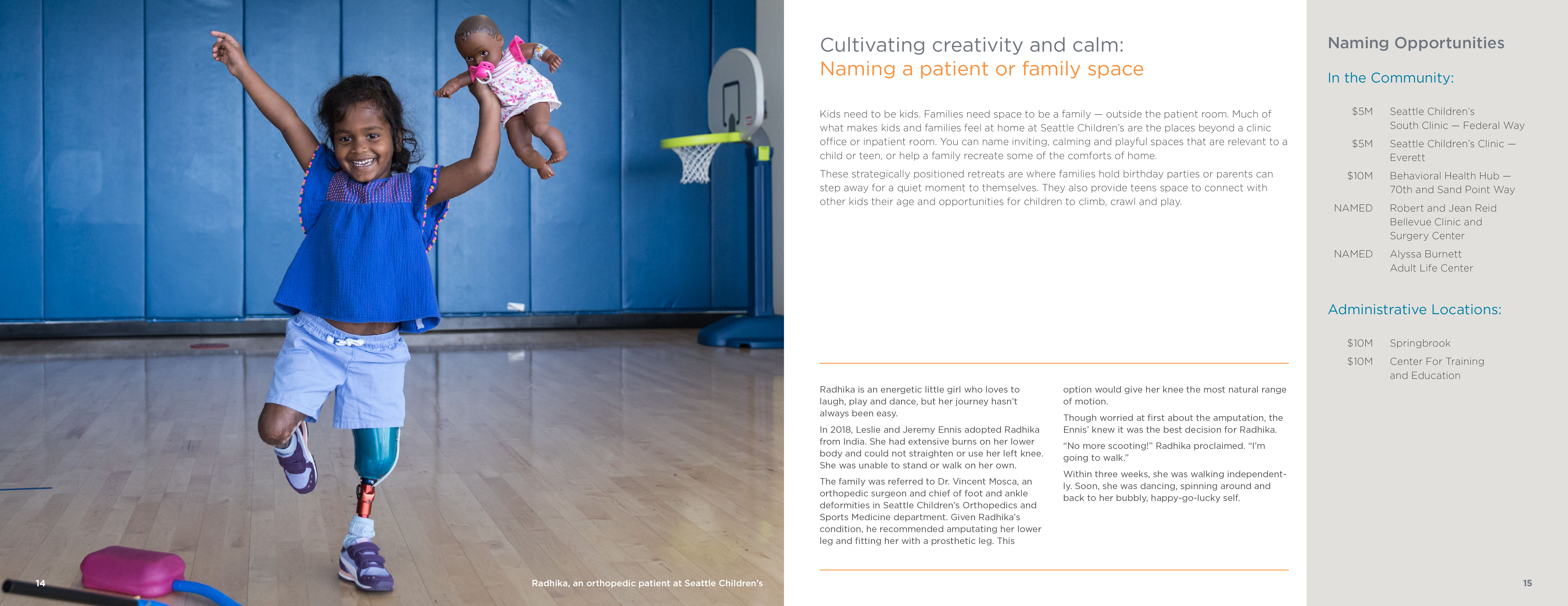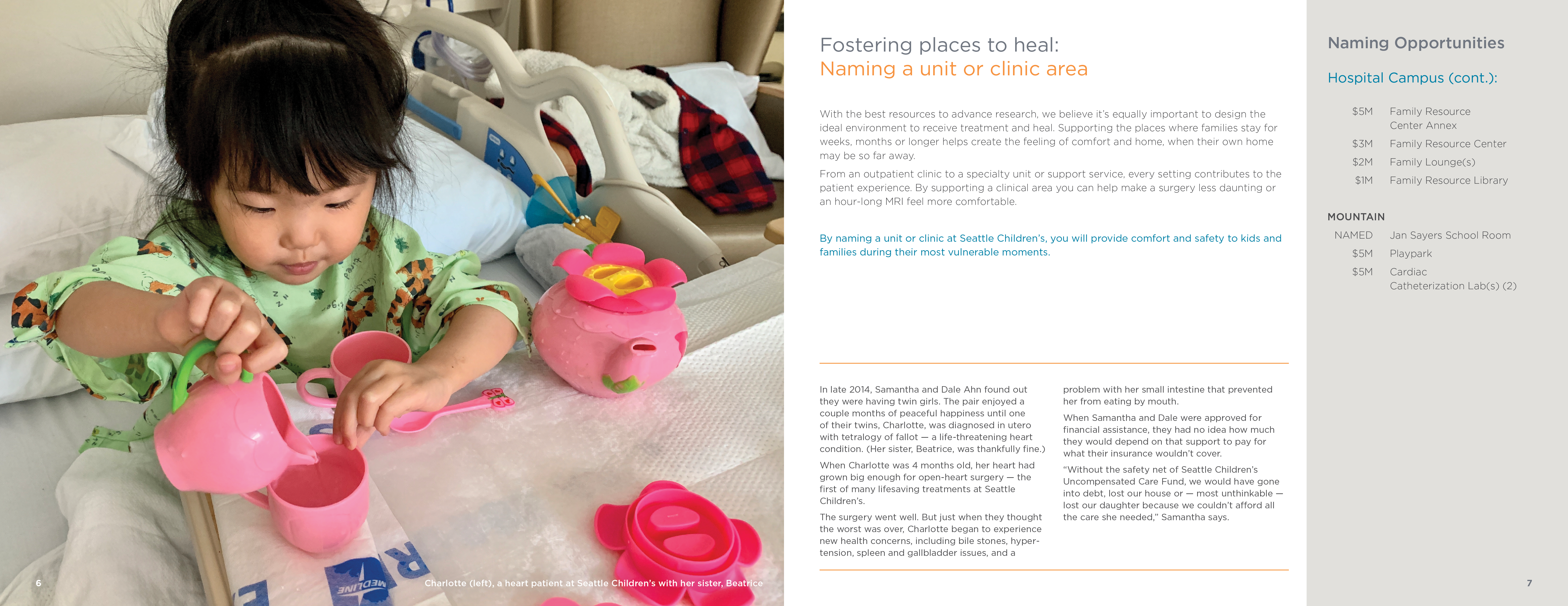 I worked with the donor stewardship team to create a concept, layout, and final design for a new naming opportunities catalogue. This is a list of all the buildings and rooms and areas that have the ability to be named for donor recognition. I wanted to integrate patient stories throughout that would inspire the donor to feel a meaningful connection to the hospital and the patients it cares for. To accomplish this, I focused on our patient ambassadors and integrated their stories throughout, placing them on the same spread as the hospital or area of the hospital that their care related to.