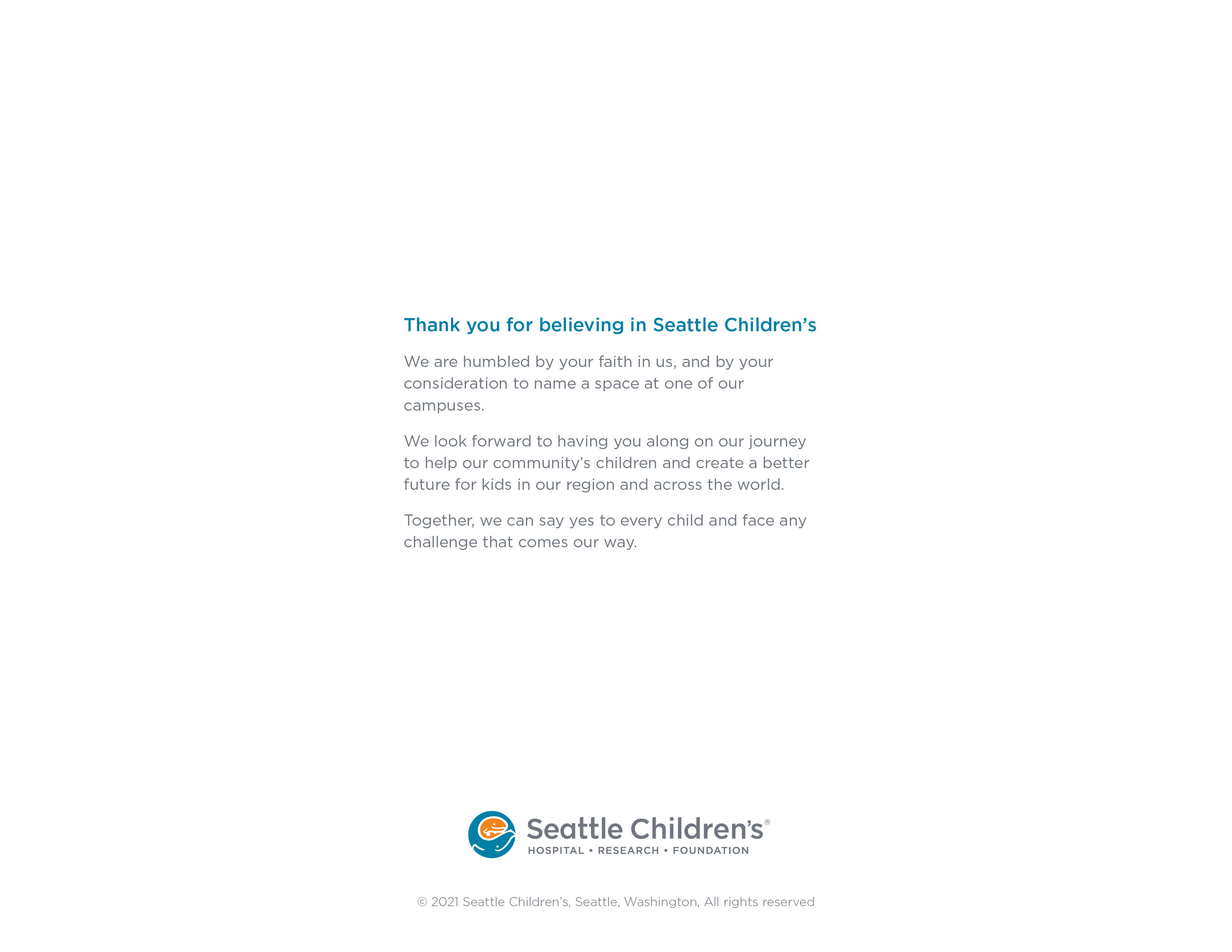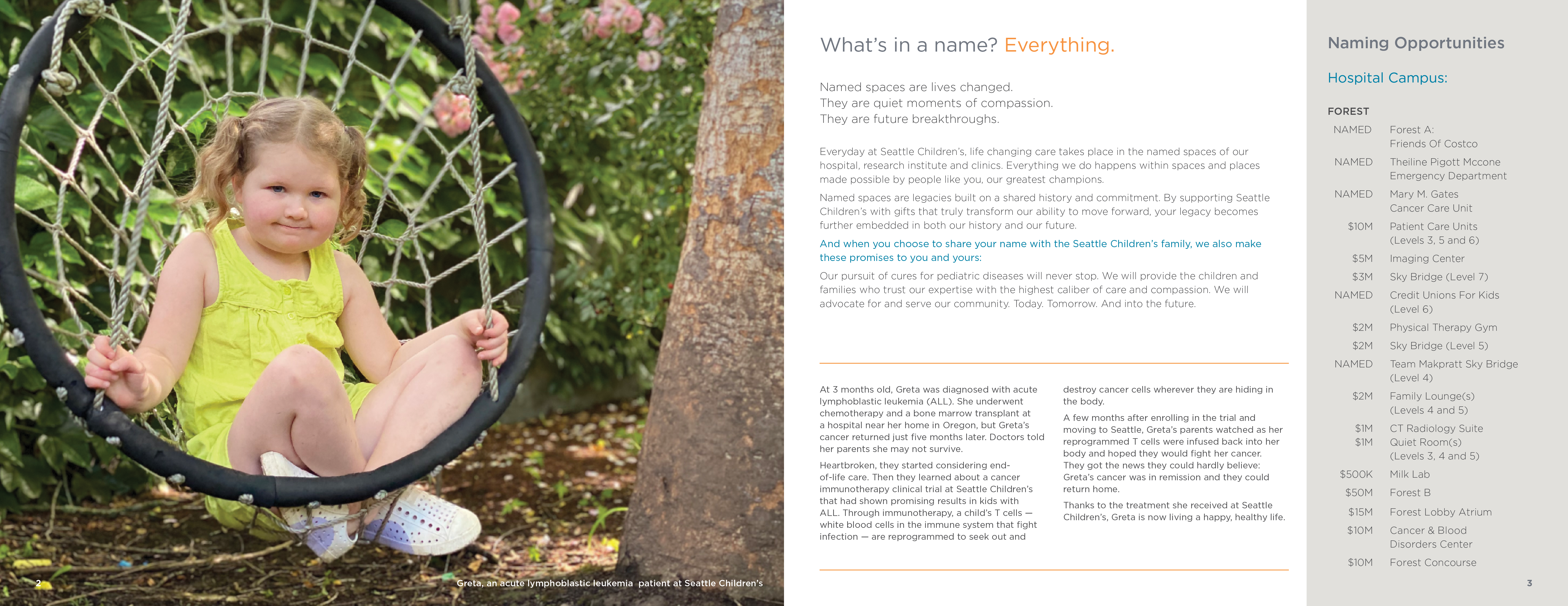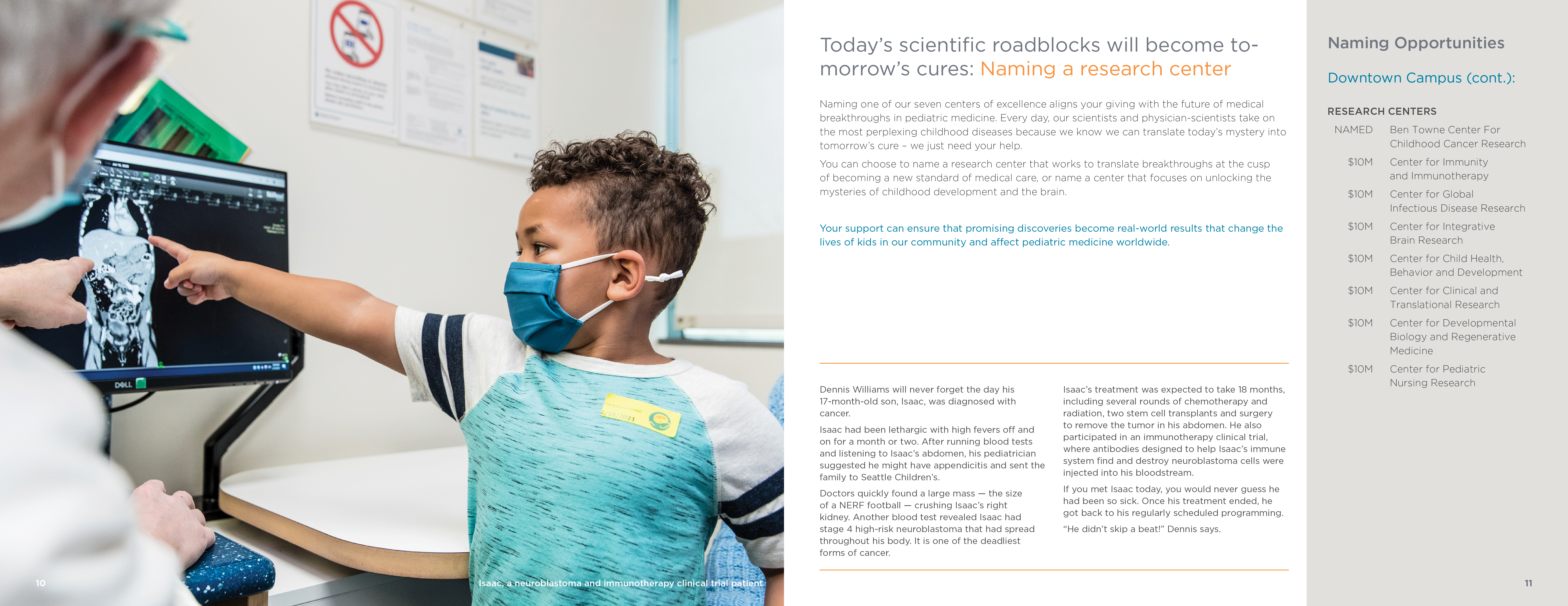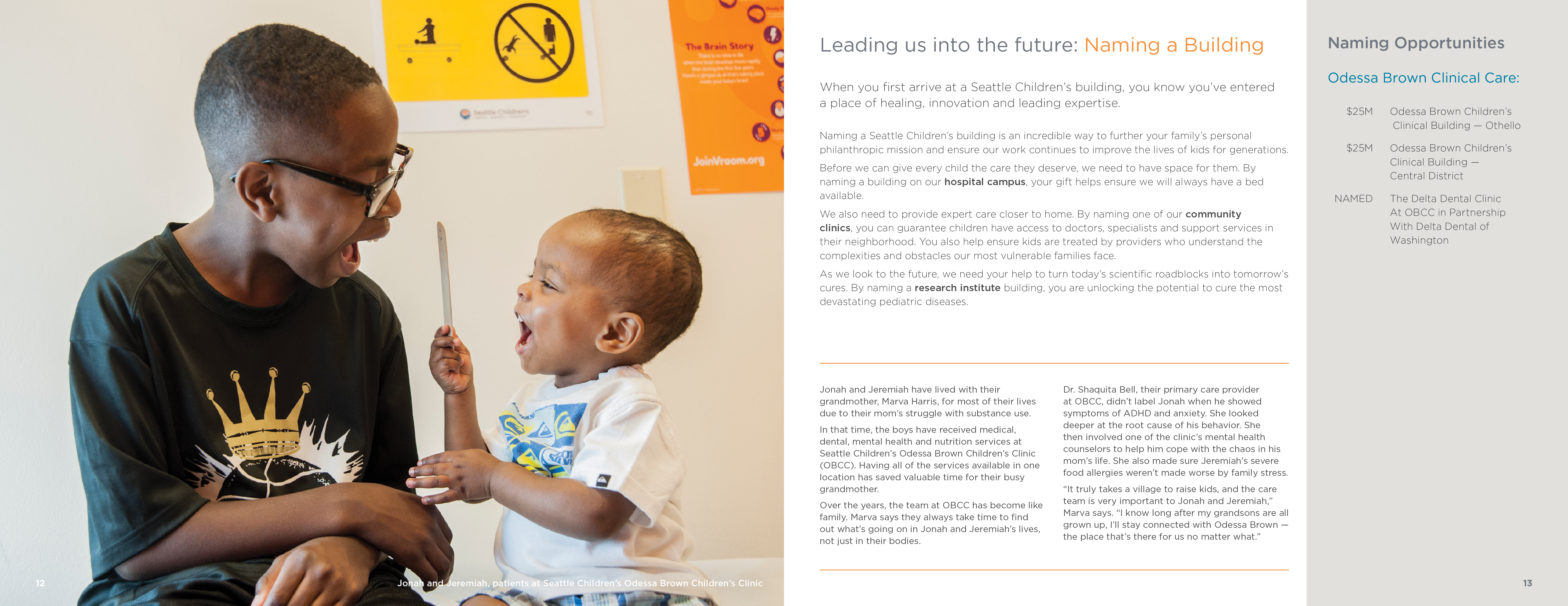I worked with the donor stewardship team to create a concept, layout, and final design for a new naming opportunities catalogue. This is a list of all the buildings and rooms and areas that have the ability to be named for donor recognition. I wanted to integrate patient stories throughout that would inspire the donor to feel a meaningful connection to the hospital and the patients it cares for. To accomplish this, I focused on our patient ambassadors and integrated their stories throughout, placing them on the same spread as the hospital or area of the hospital that their care related to.