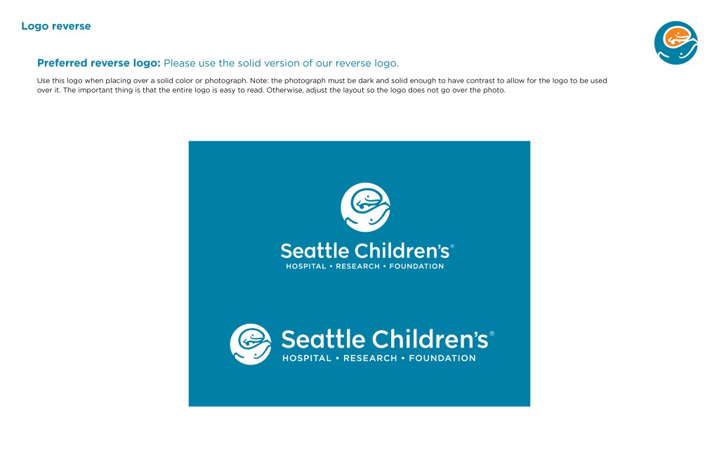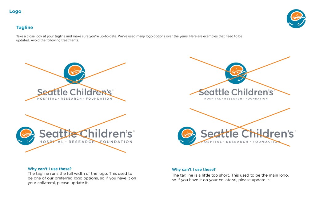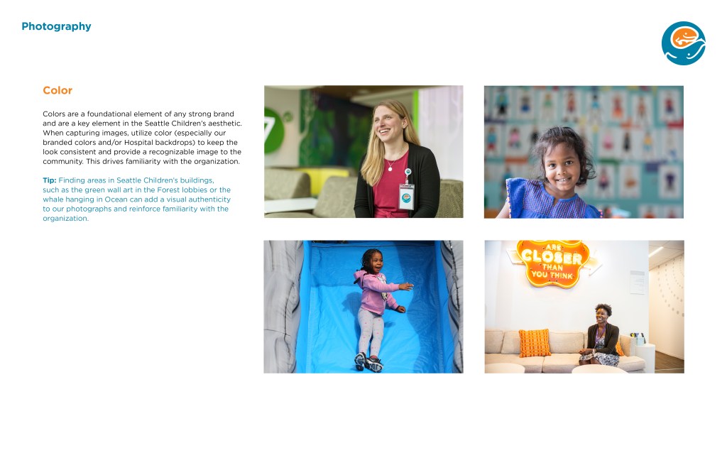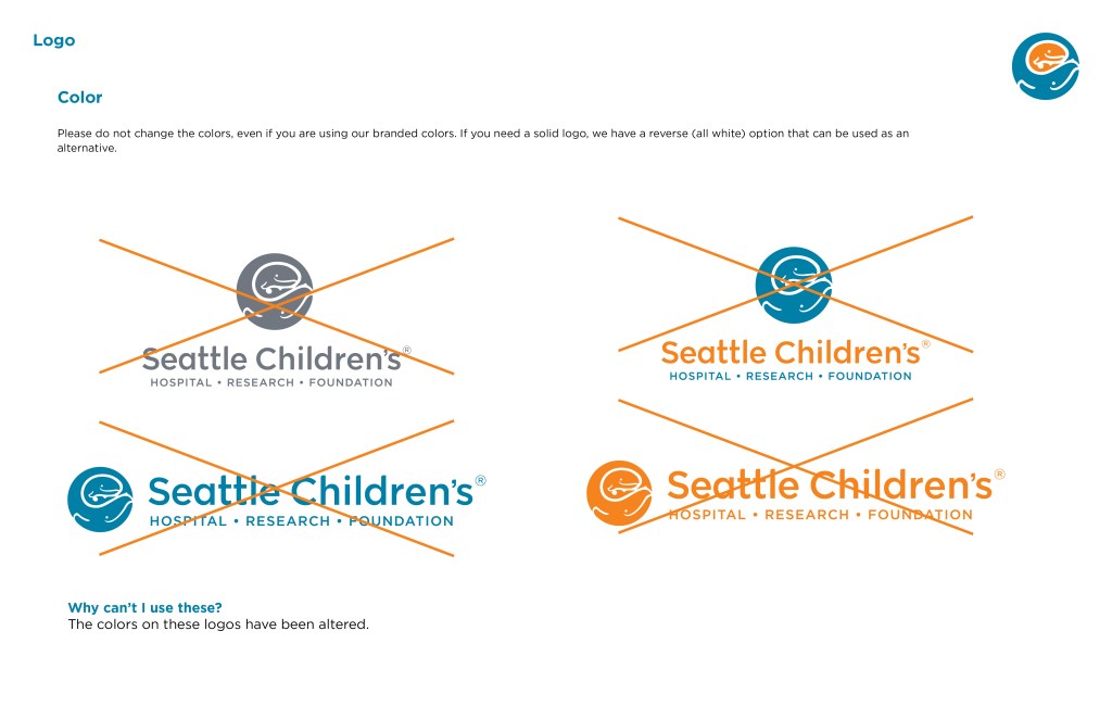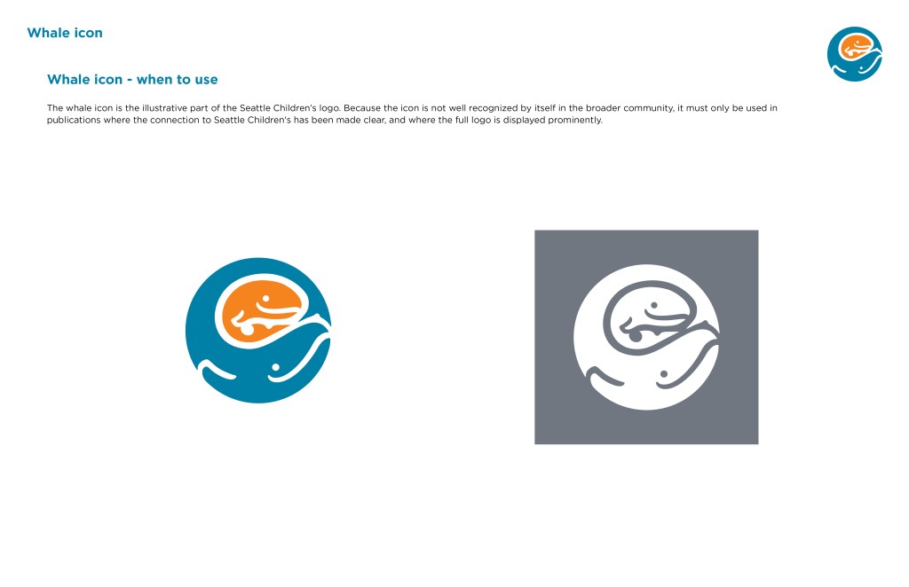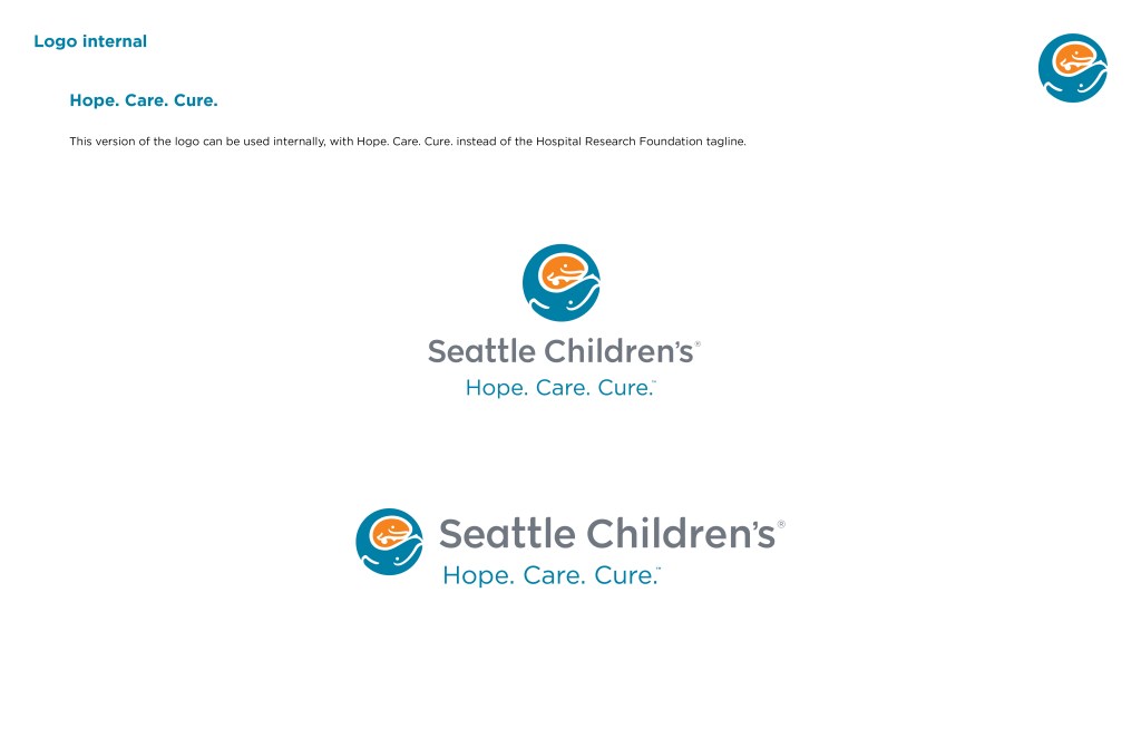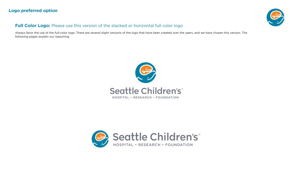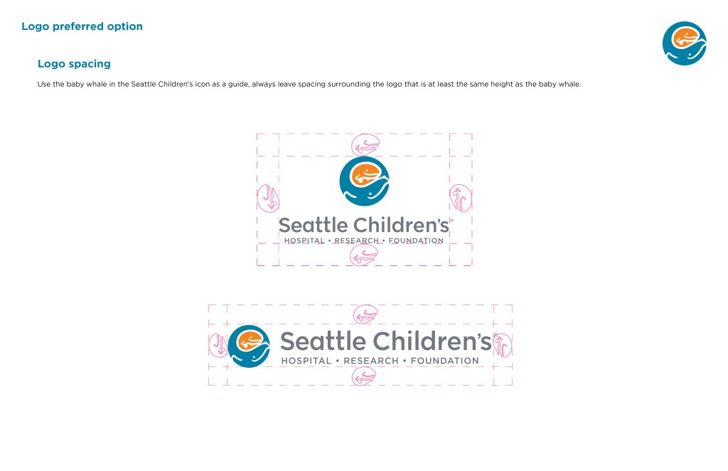 I had the amazing opportunity to do a complete visual refresh of the Seattle Children’s Brand in 2020 starting with the logo which I updated to make more open and easier to see from far away (the older logo has smaller strokes and whale eyes). I also consolidated our color palette from 28 colors to 3 primary and 3 secondary. I also created layout and photography guidelines that were used throughout the organization on all collateral – digital, print, and environmental.