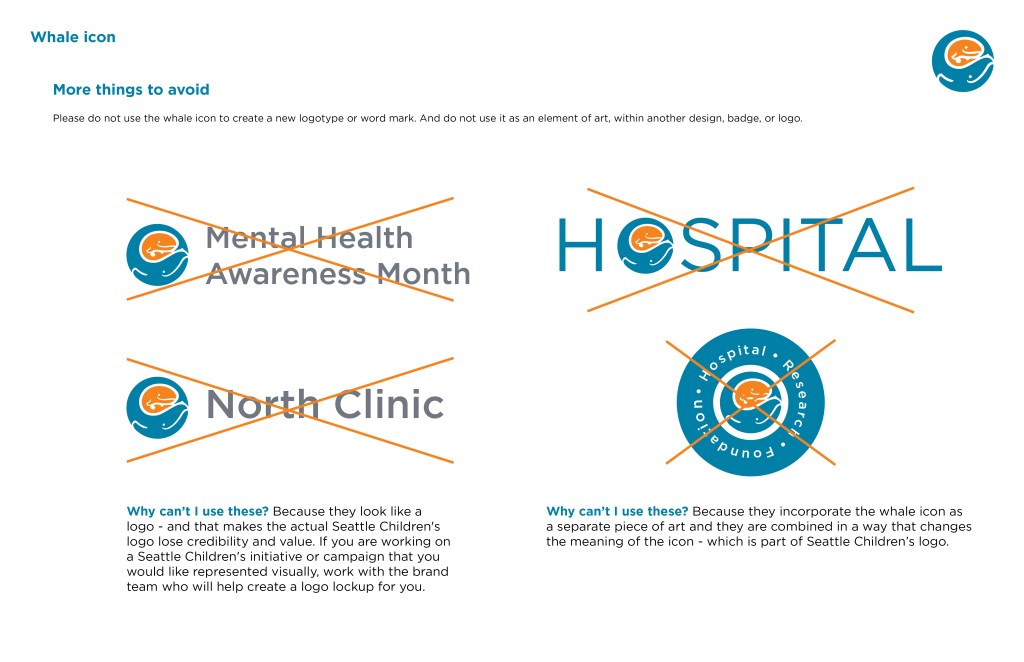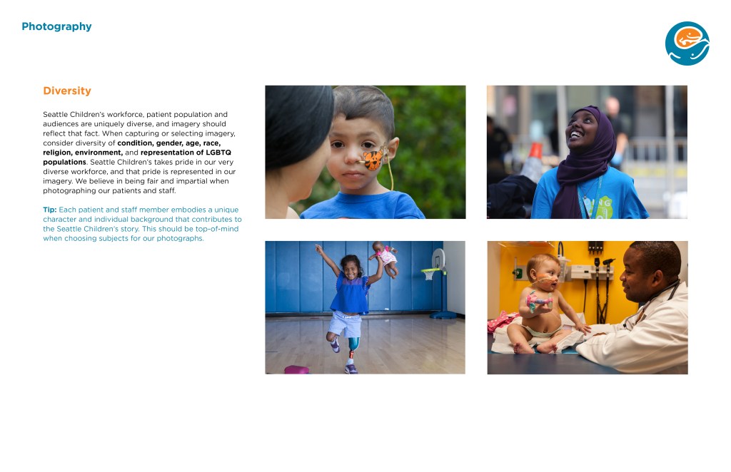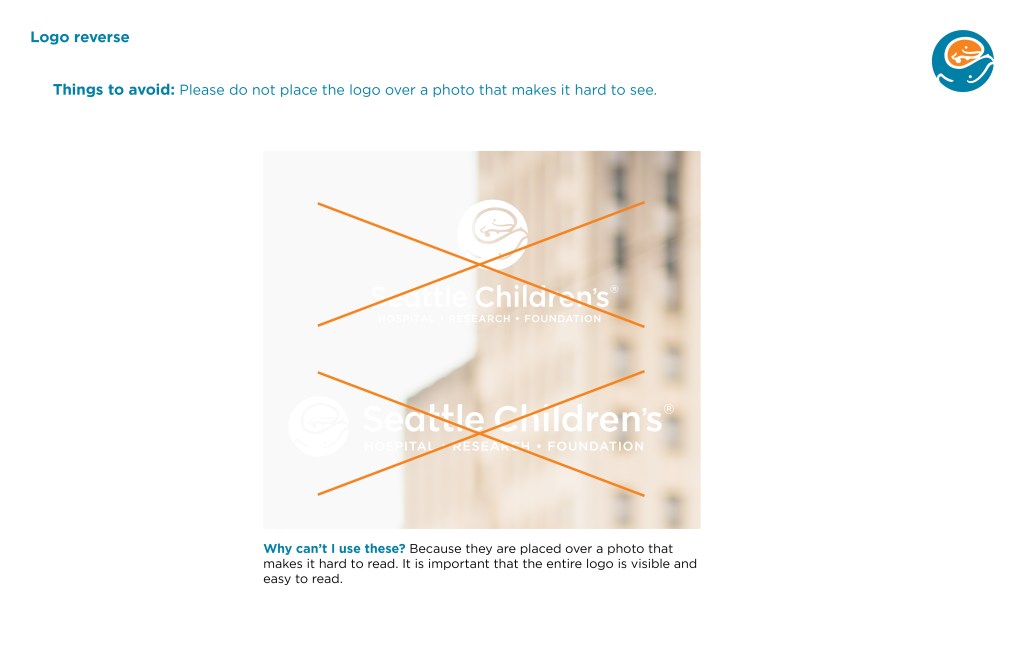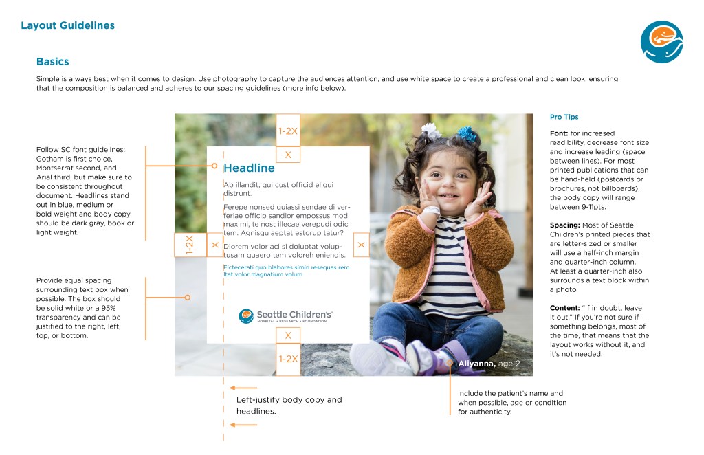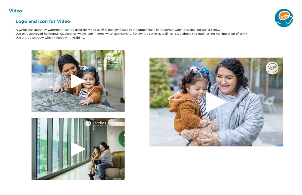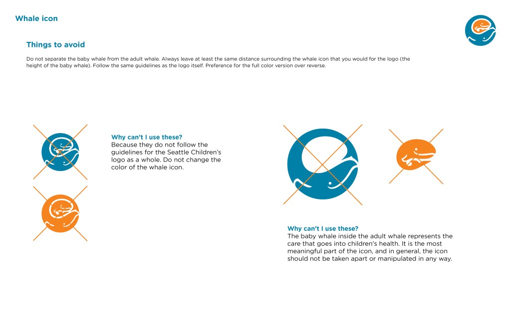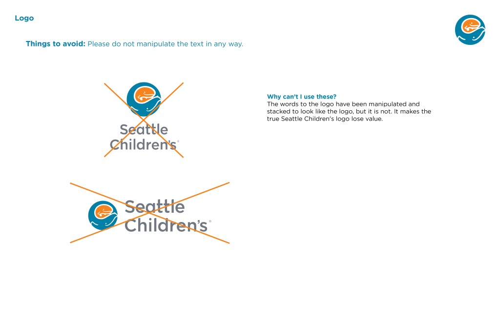 I had the amazing opportunity to do a complete visual refresh of the Seattle Children’s Brand in 2020 starting with the logo which I updated to make more open and easier to see from far away (the older logo has smaller strokes and whale eyes). I also consolidated our color palette from 28 colors to 3 primary and 3 secondary. I also created layout and photography guidelines that were used throughout the organization on all collateral – digital, print, and environmental.