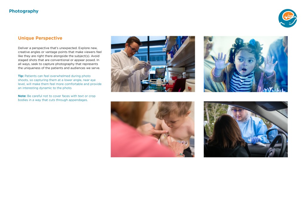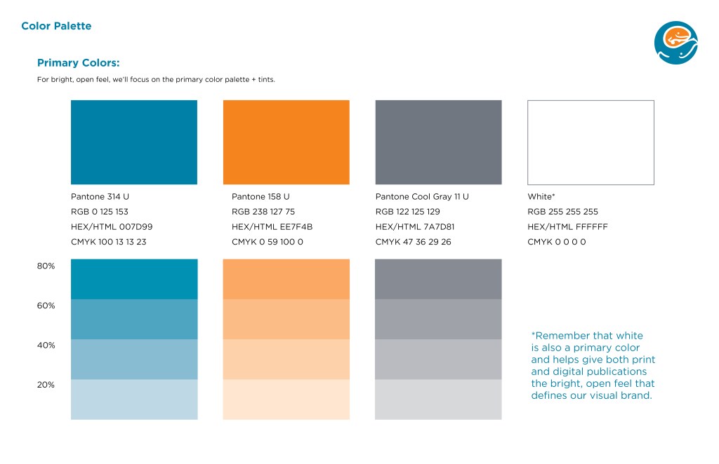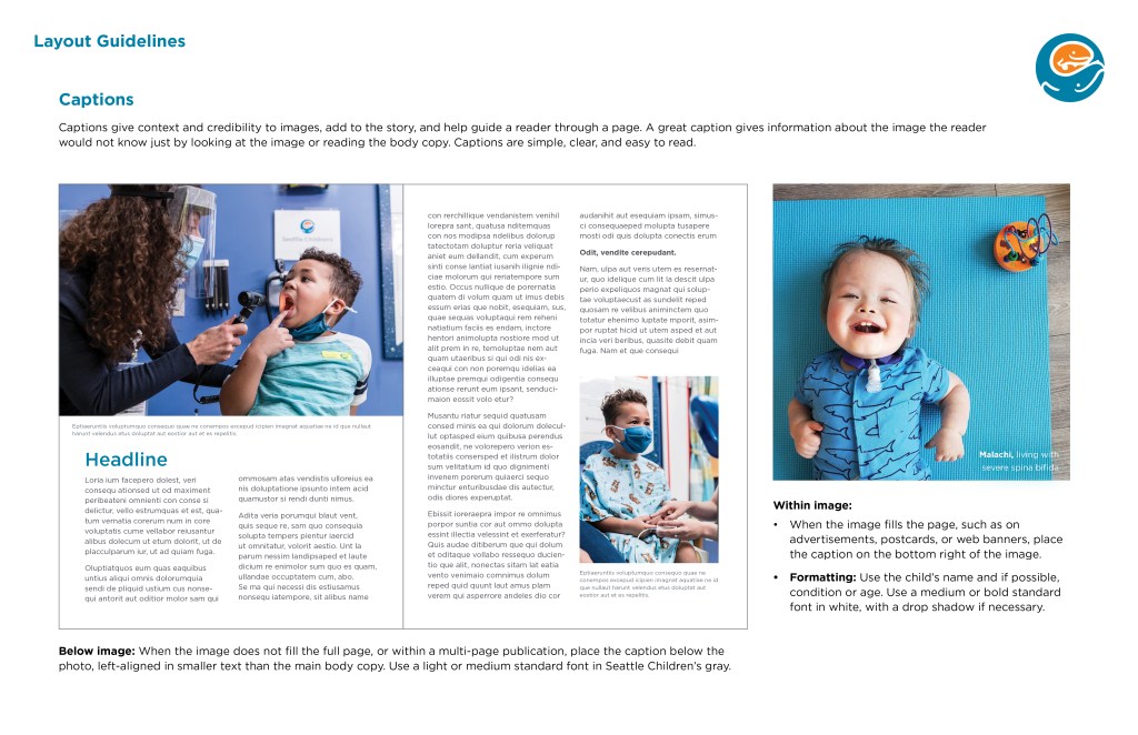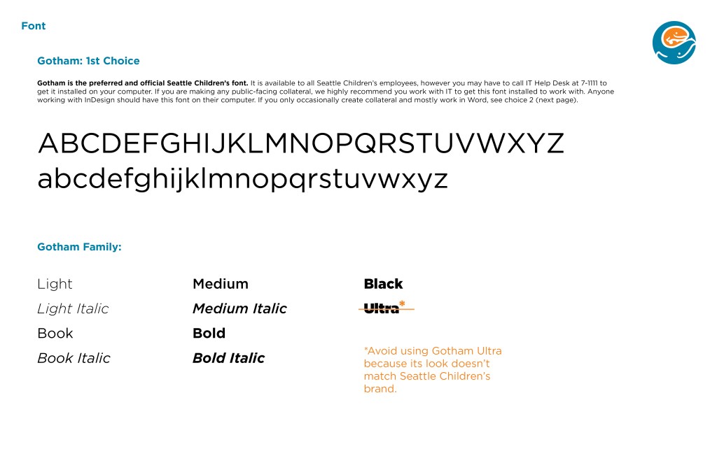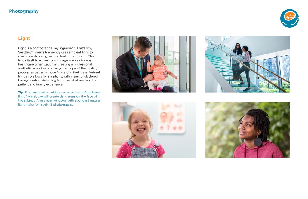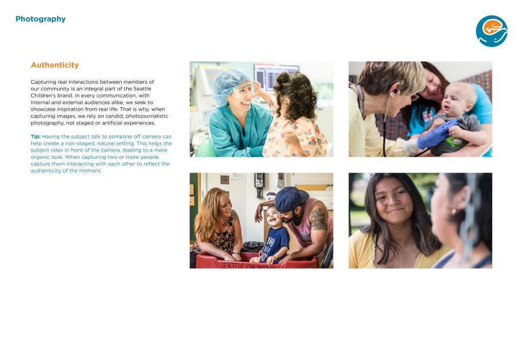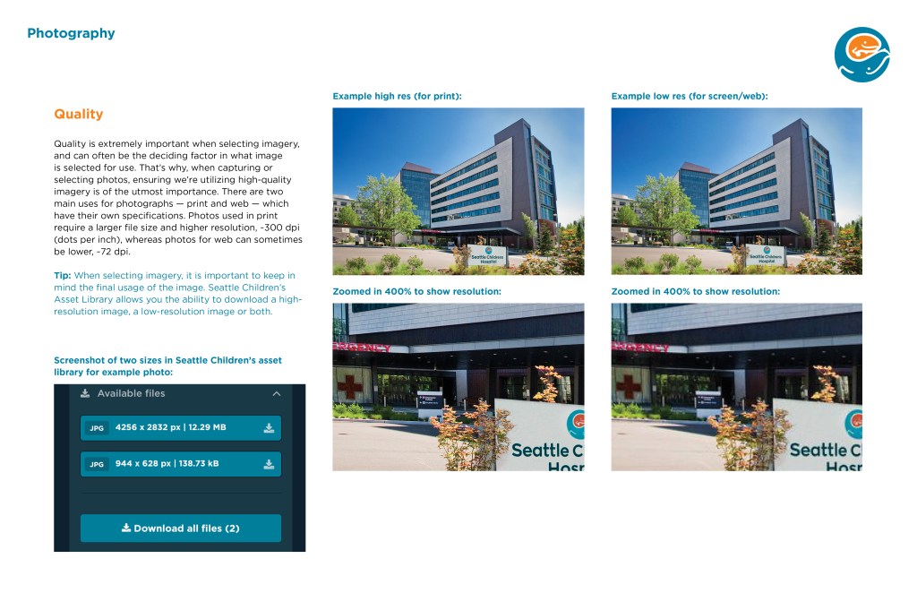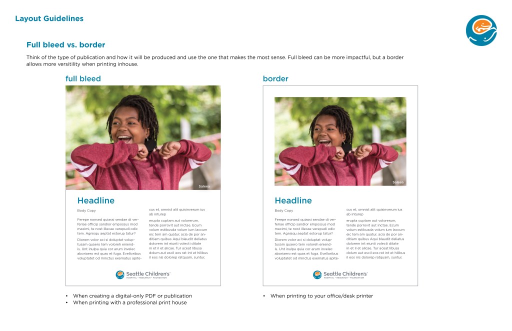 I had the amazing opportunity to do a complete visual refresh of the Seattle Children’s Brand in 2020 starting with the logo which I updated to make more open and easier to see from far away (the older logo has smaller strokes and whale eyes). I also consolidated our color palette from 28 colors to 3 primary and 3 secondary. I also created layout and photography guidelines that were used throughout the organization on all collateral – digital, print, and environmental.